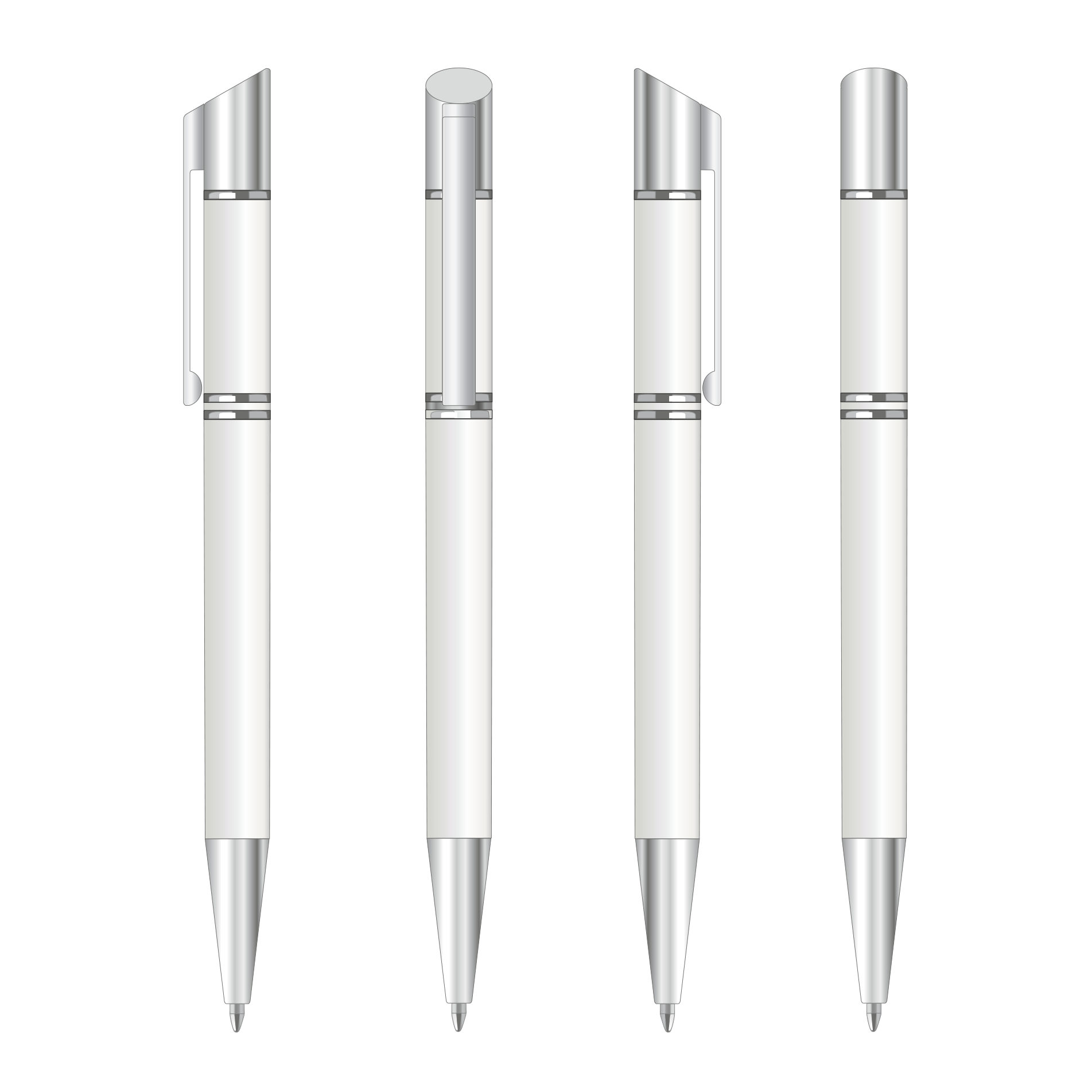 Długopis aluminiowy z białym oksydowanym korpusem i srebrnymi dekoracyjnymi pierścieniami. Prosty srebrny klips i końcówka. Nadruk wykonywany jest na dłuższej części korpusu.