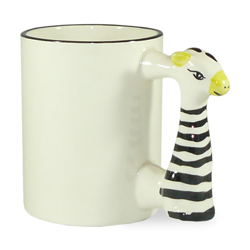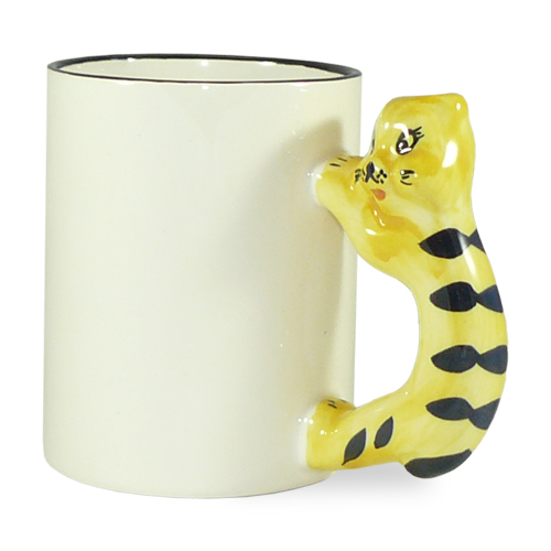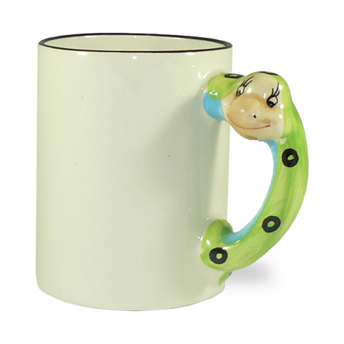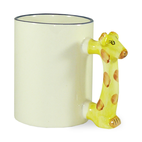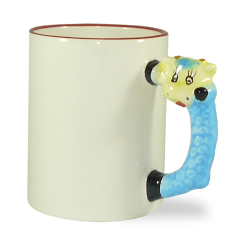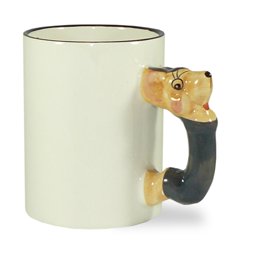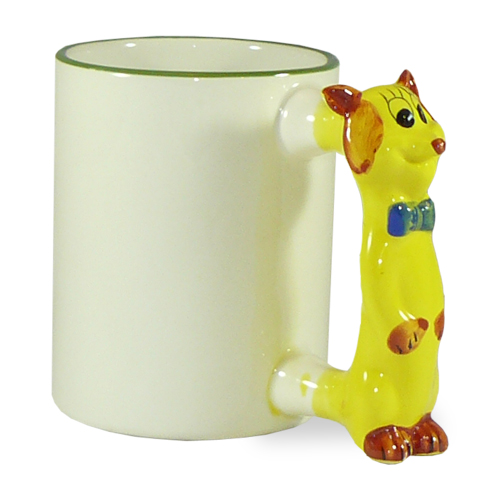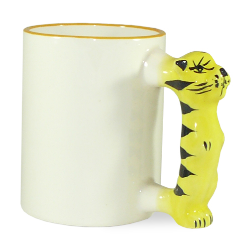 Biały kubek ceramiczny z uszkiem w kształcie zwierzątka, powlekany warstwą poliestru do wykonywania nadruków w technologii sublimacji.