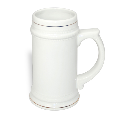 Biały kufel ceramiczny ze złotym ornamentem, powlekany warstwą poliestru do wykonywania nadruków w technologii sublimacji.