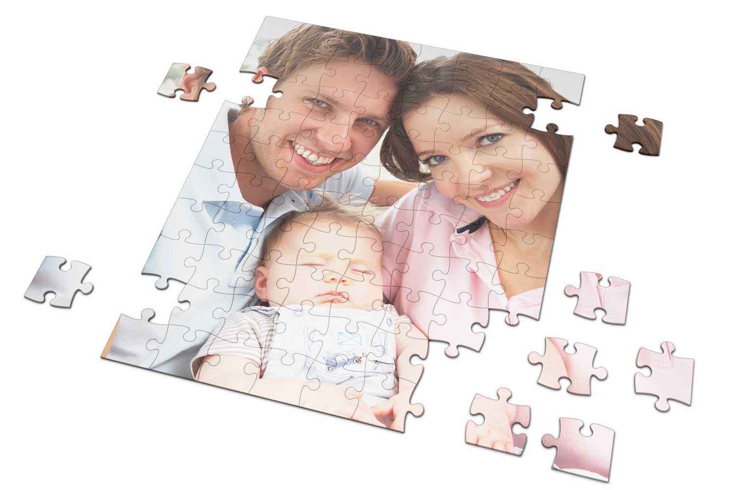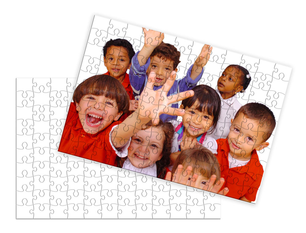 Tekturowe Fotopuzzle przeznaczone do nadruku wykonane na niebieskiej tekturze puzzlowej. Zapakowane w tekturowe pudełko ze zdjęciem nadrukowanym na puzzlach.